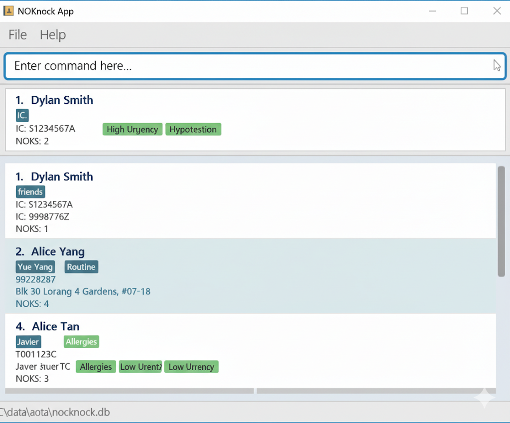 NOKnock is a CLI-based nursing home management system for tracking patients, their Next-of-Kin (NOK) contacts, and caring sessions. Designed for nursing home staff who prefer command-line interfaces for fast, efficient daily operations.